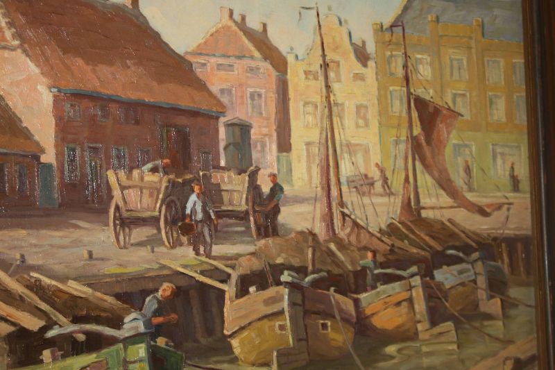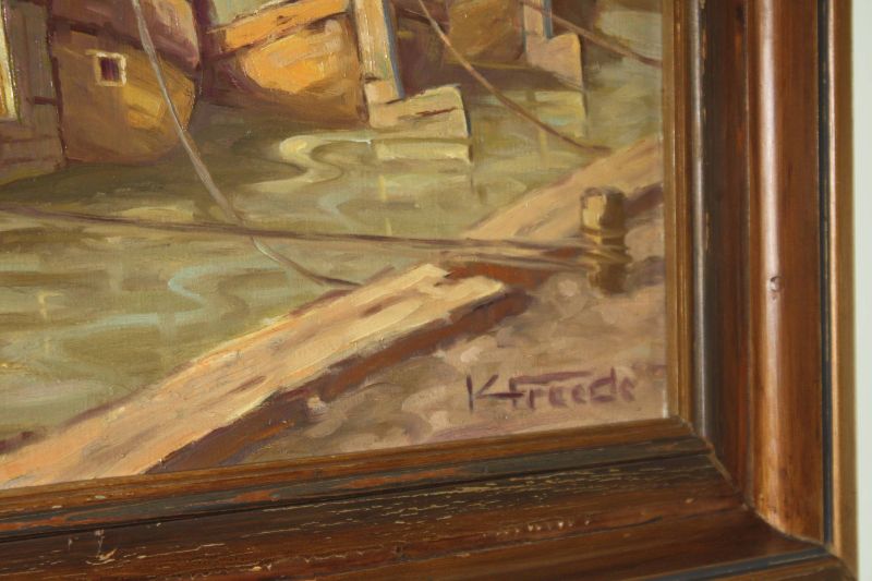 A huge German 20th century small town (Weener) harbour scene oil painting by Karl Freede, oil on panel, Size (incl. frame); 49.21'' (125 cm) x 43.31'' (110 cm)