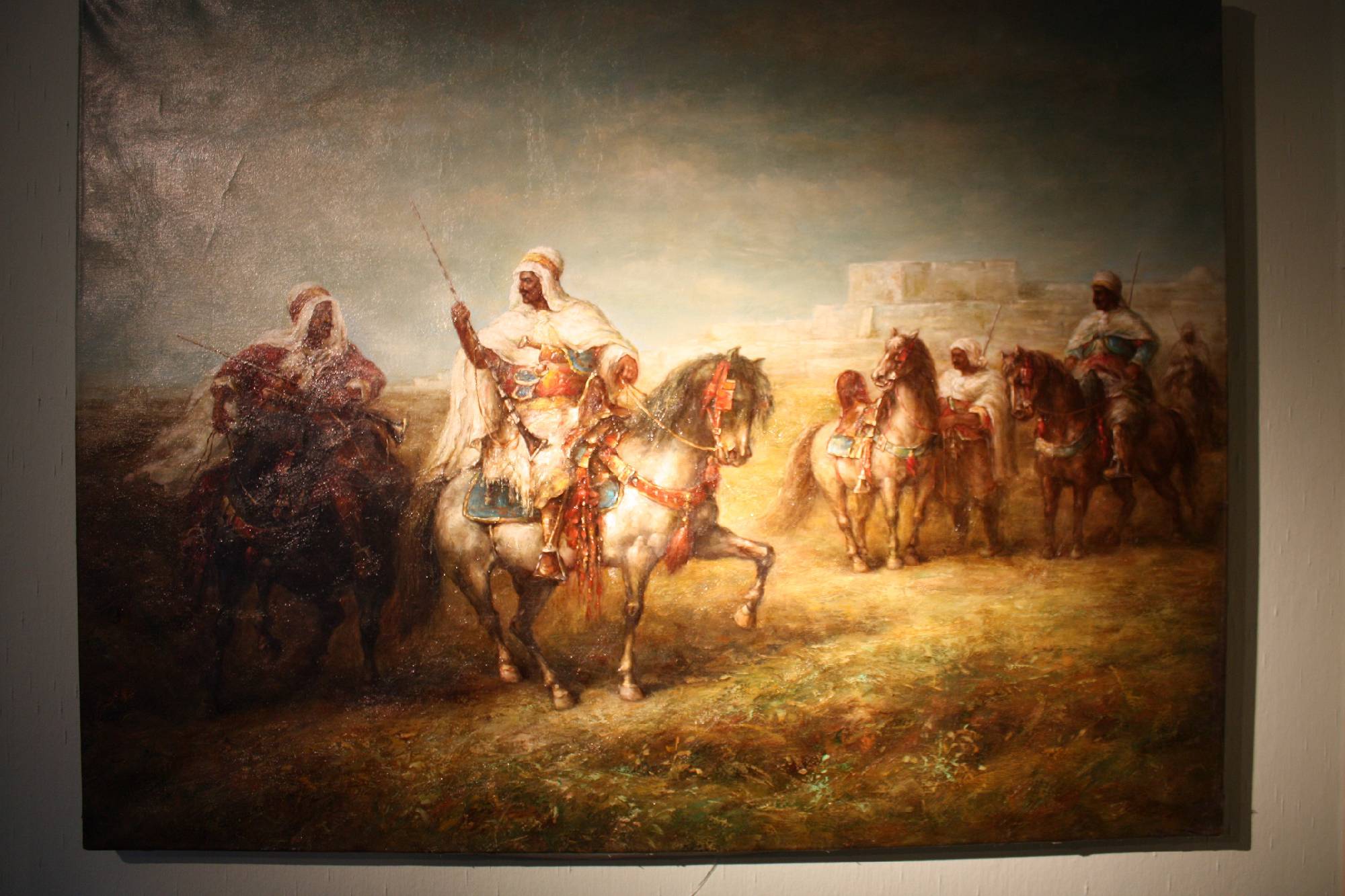Large 20th century painting oil on canvas scenery of Arabic soldiers on horses, after Adolf Schreyer, Size: 47.24'' (120 cm) x 35.43'' (90 cm)