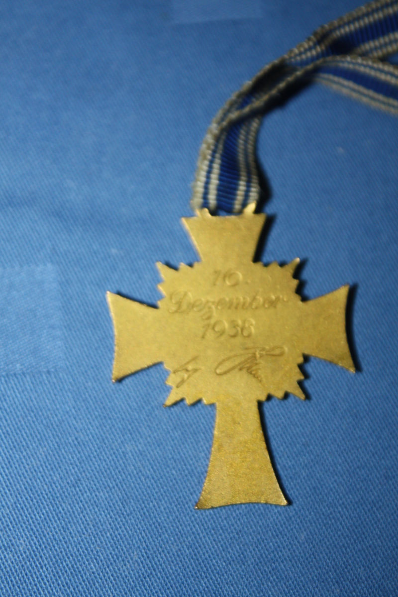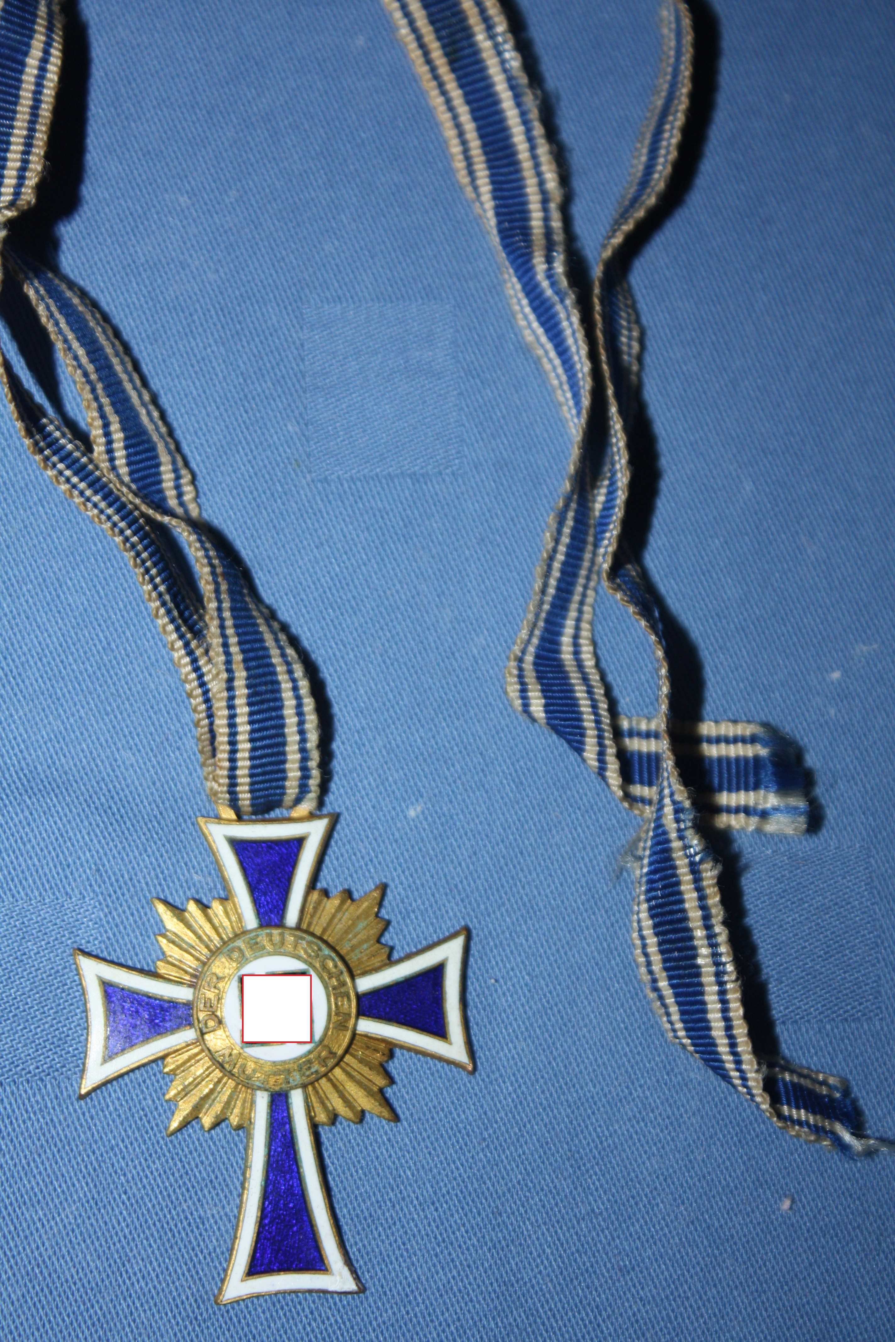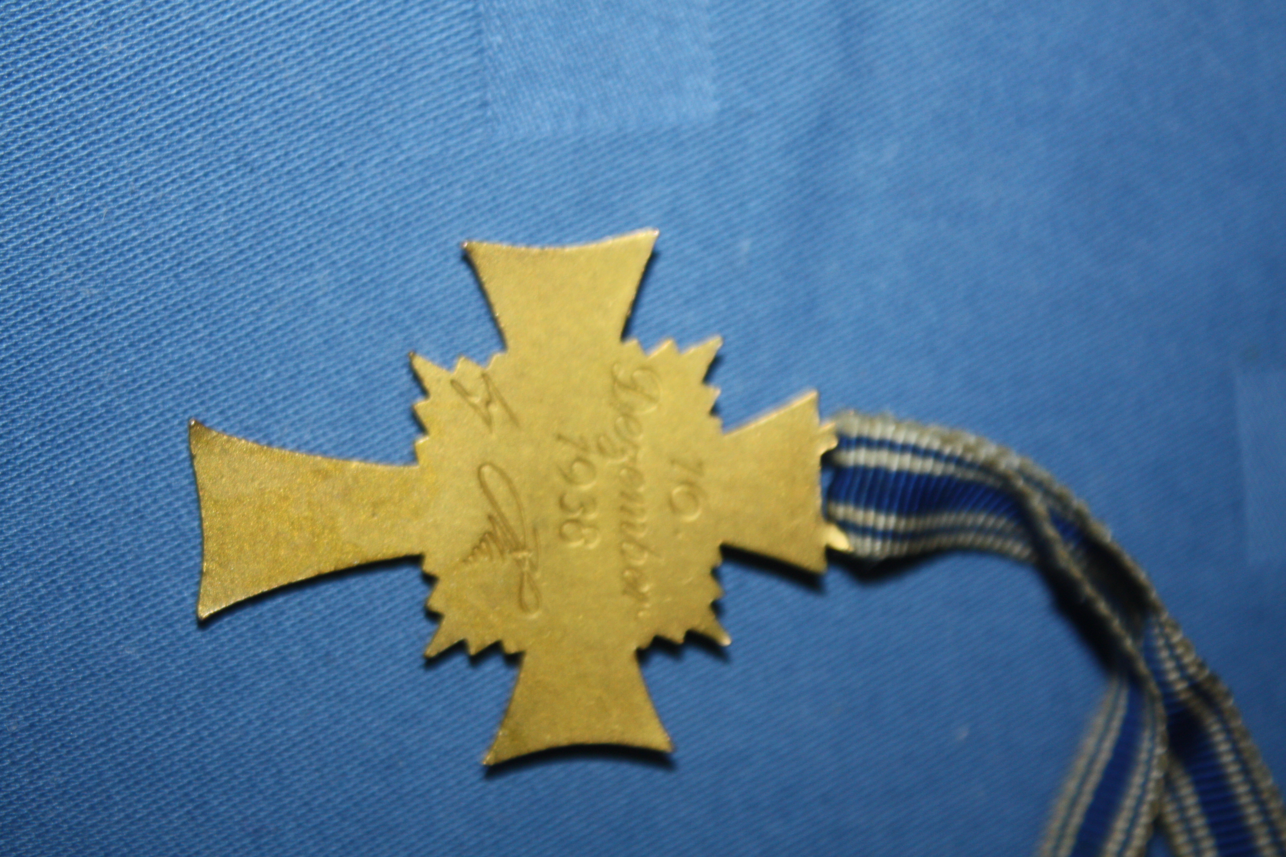 A WW2 Mother's Cross Mutterkreuz 1. Stufe with certificate Award for mothers of 8 children, enamel damaged, with ribbon