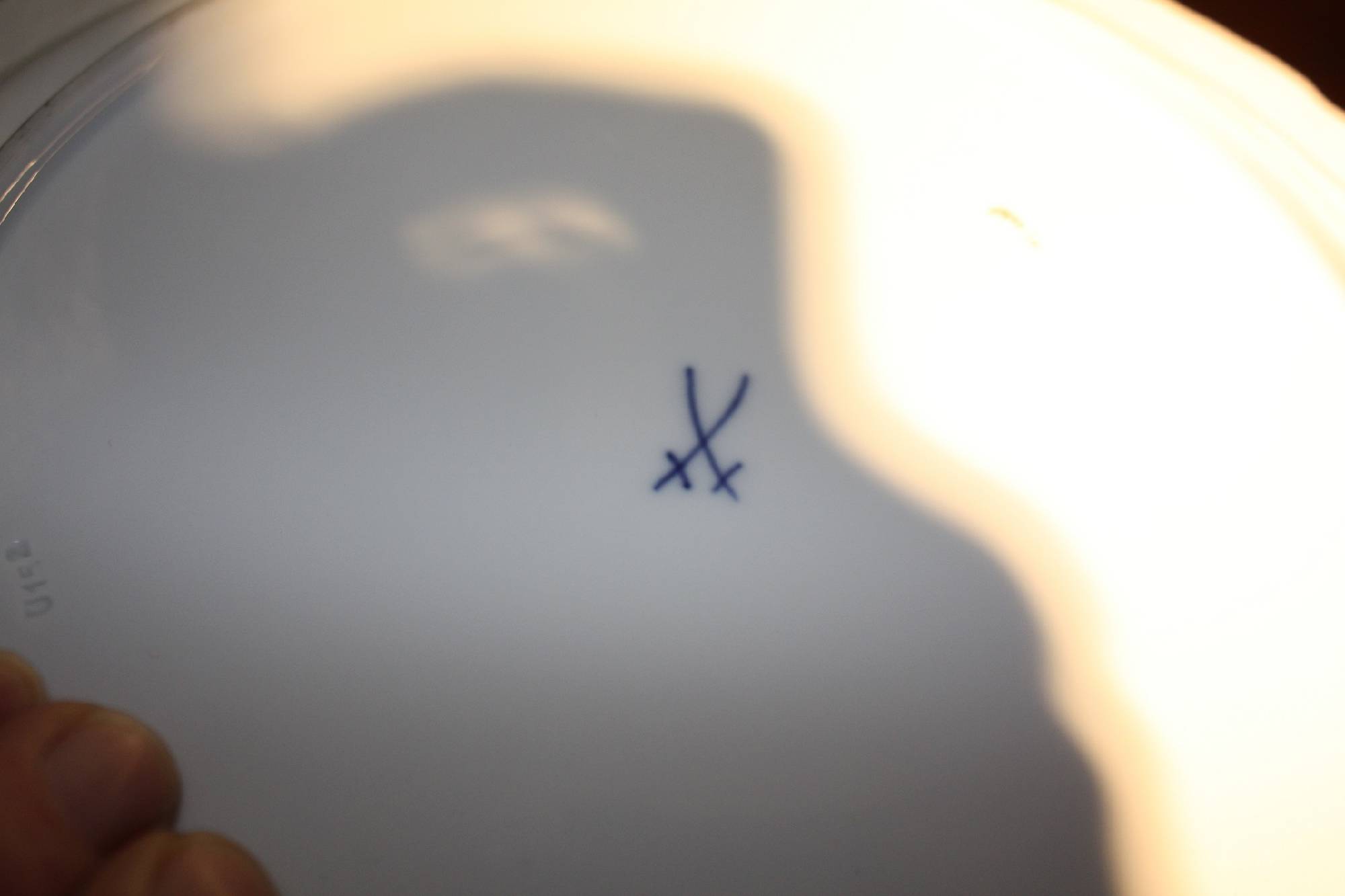A decorative 20th century blue, white and golden ornate relief Meissen plate, Diameter: 10.63'' (27 cm)